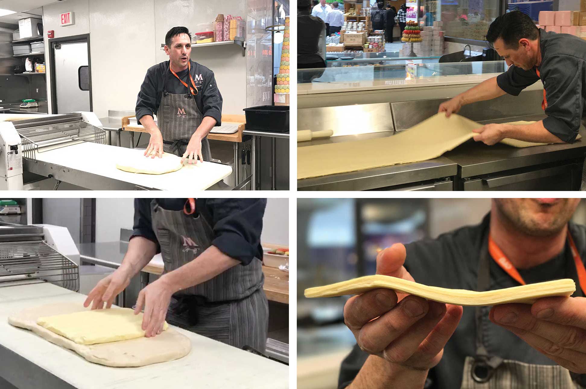 First, the 5 feet of croissant dough is stretched onto a refrigerated table where it is cut using a custom roller. One of Mélange’s Executive Chefs Raphael Boeri, a former student of Torres’, holds up the finished product – perfect layers of flakey, buttery dough.
