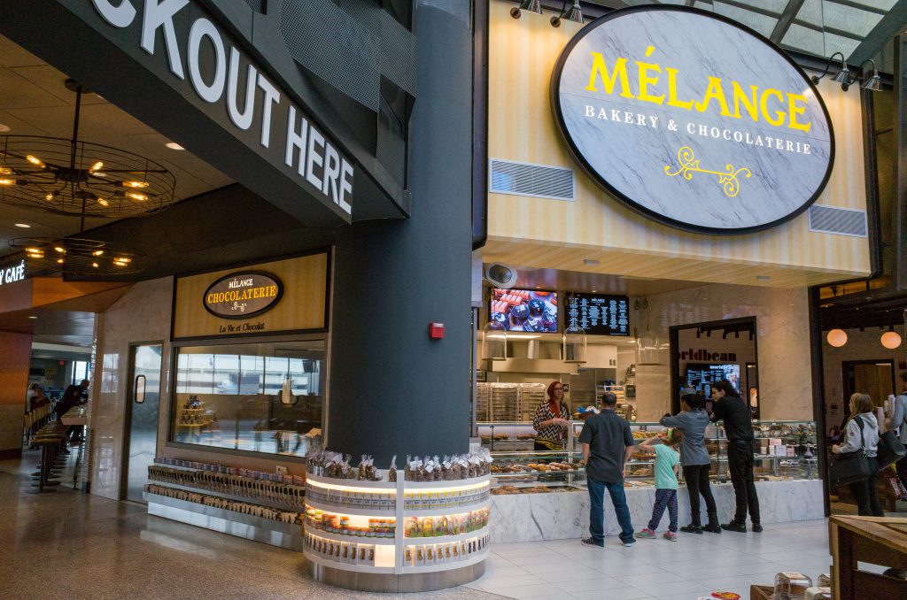 Mélange’s classically trained pastry chefs and chocolatiers work in a fully equipped, exposition kitchen that prepares baked goods and chocolates for passengers and the restaurants located in Terminal C. Both now have access to authentic croissants made with 100 percent French butter, New York-style hand-rolled bagels, cupcakes, doughnuts, éclairs, macarons, muffins, cookies, cakes and tarts. They can also enjoy handcrafted chocolate bars, bites, barks, truffles and bon bons made with Valrhona Chocolate.
