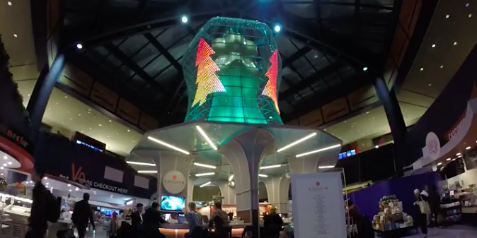 We’re at the peak of the Holiday travel season and what a great time to put the versatility of Kaedama’s unique design feature to use. A 40 foot-tall art installation created by design partner Rockwell Group features an array of custom Japanese-inspired transitional animations but in the spirit of the Holidays it has been modified to bring a little seasonal cheer indoors!
