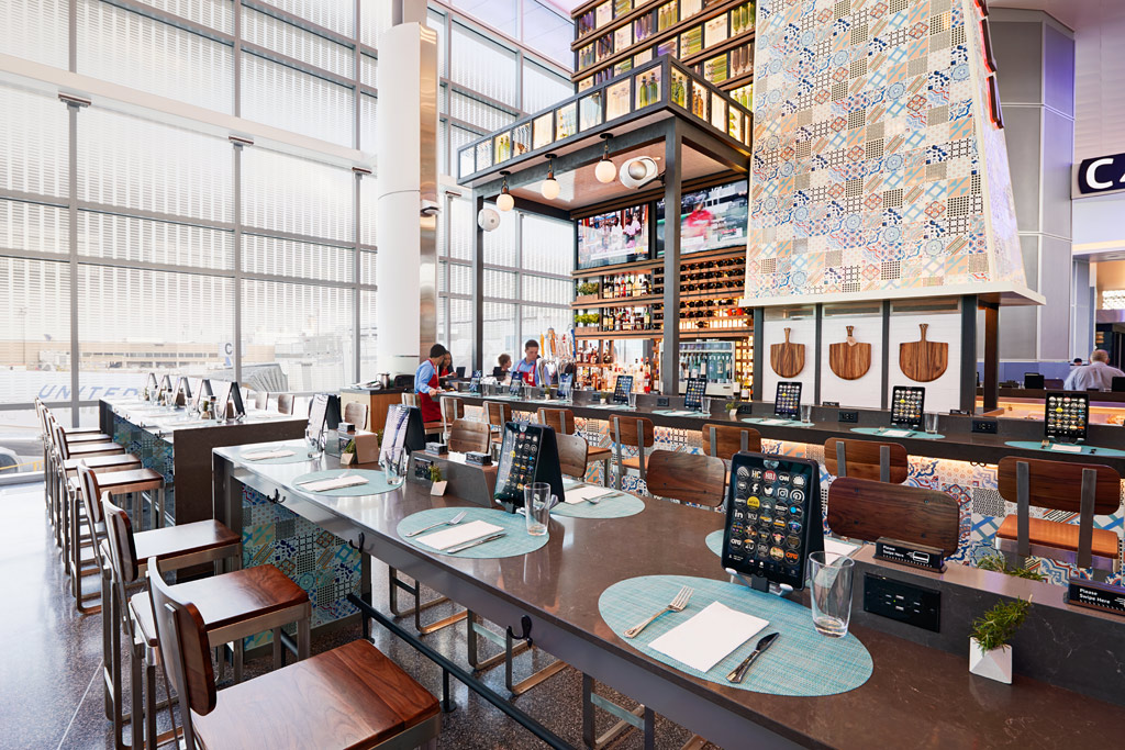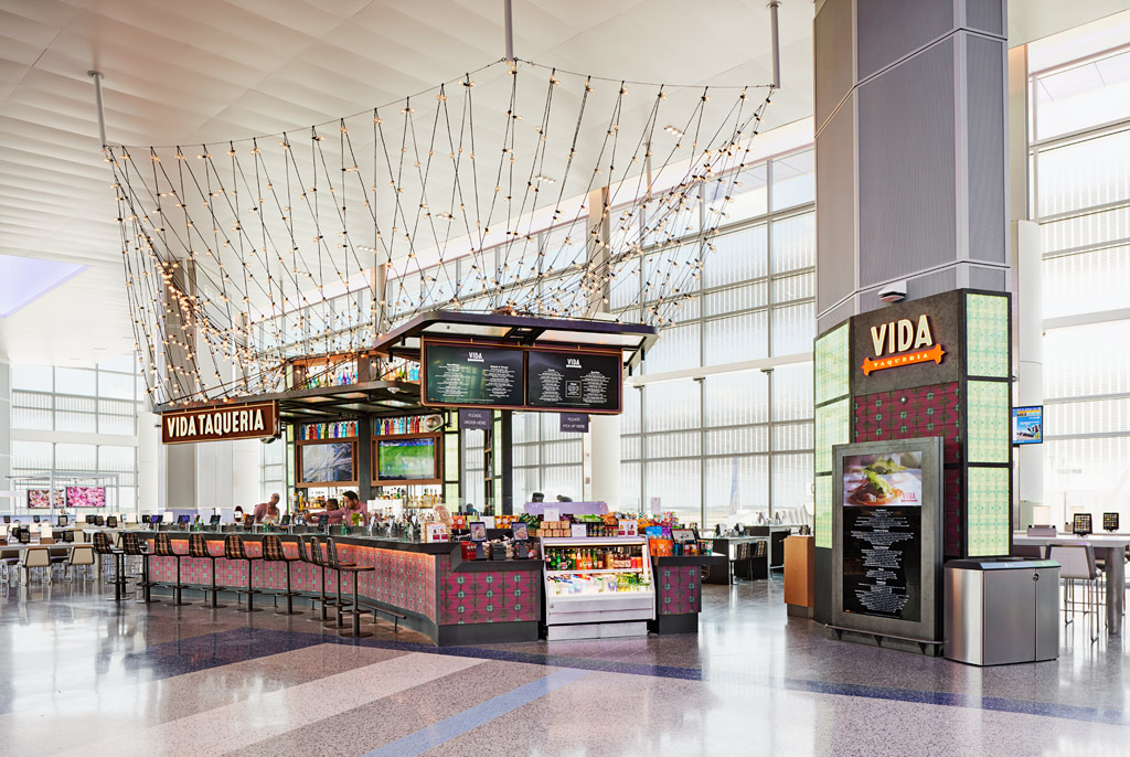 The terminal, designed by Rockwell Group features 5 main concept build-outs with uniquely beautiful architectural elements from suspended lights above Vida Taqueria to a dramatic tower clad in porcelain tiles from Capri, Italy at Pala. The terminal C-North restaurants feature “Social Media Moments” within their design to engage passengers in-terminal and online.